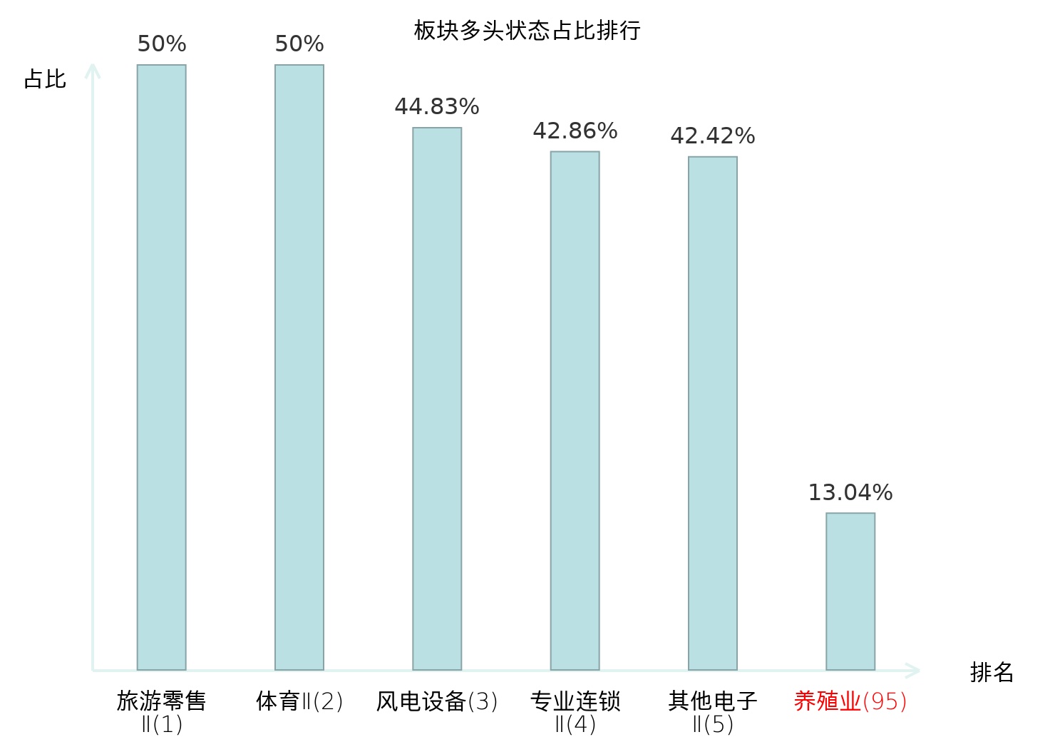 全市场所有行业板块中主力多头状态占比排名中,旅游零售Ⅱ板块位居第一。化妆品板块名次提升最快,较昨日上升66位。