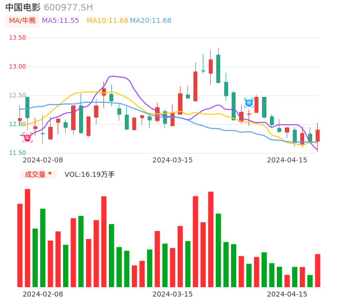 04月15日,中国电影收报11.90,股价涨幅1.88%,成交金额1.92亿元,换手率0.87%。