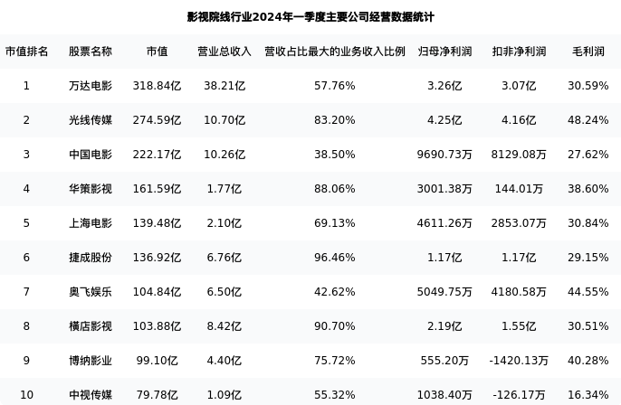 中国电影最新报告期数据为一季度,下表汇总了影视院线行业内市值靠前的公司一季度主要经营数据