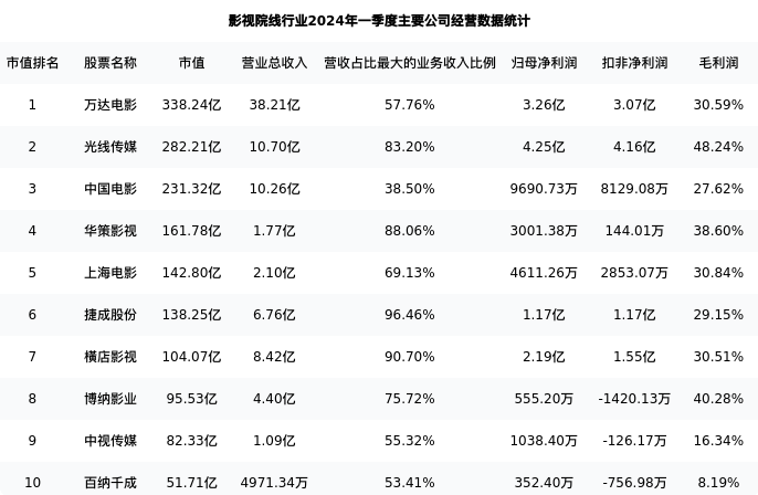 中国电影最新报告期数据为一季度,下表汇总了影视院线行业内市值靠前的公司一季度主要经营数据