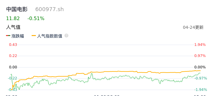 04月24日,中国电影收报11.82,股价涨幅-0.51%,成交金额1.66亿元,换手率0.76%。