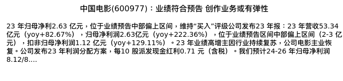 值得注意的是:2024年04月华泰证券的朱珺/周钊分析师,首次发布关于中国电影的研究报告,标题为:中国电影(600977):业绩符合预告 创作业务或有弹性。