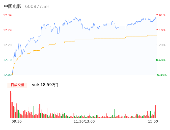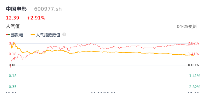 04月29日,中国电影收报12.39,股价涨幅2.91%,成交金额2.28亿元,换手率1.00%。