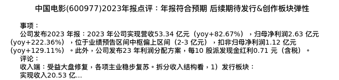 值得注意的是:2024年04月华创证券的刘欣分析师,首次发布关于中国电影的研究报告,标题为:中国电影(600977)2023年报点评:年报符合预期 后续期待发行&创作板块弹性。