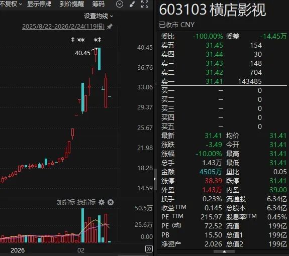 以横店影视为例,该公司2026年以来股价大幅上涨,1月5日至2月10日累计涨幅超过140%。2月24日,横店影视开盘后一字跌停。