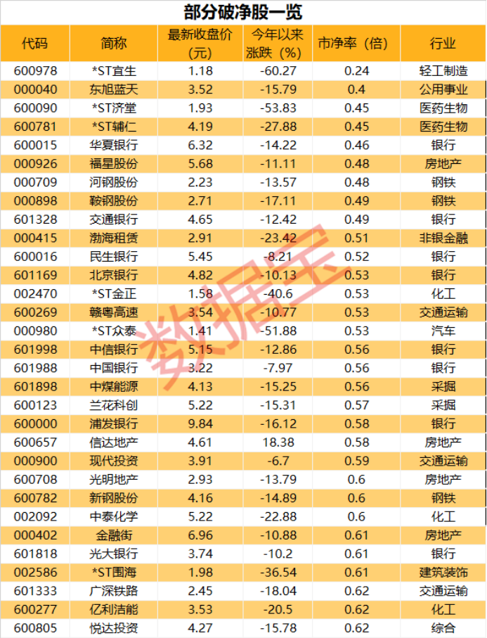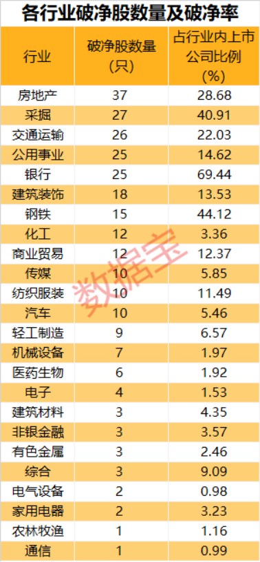 按申万所属一级行业划分,房地产股是破净高发地,共有37只个股上榜;采掘、交通运输行业数量位居第二、第三,分别有27只、26只个股上榜。