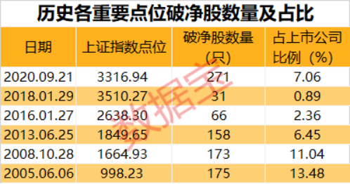 纵观以往几次重要的历史底部,最近的一次沪指2638点时破净股数量有66只,沪指1664点时破净股有173只。然而,当历史沪指5178点高位和6124点高位时,已不存在破净股。