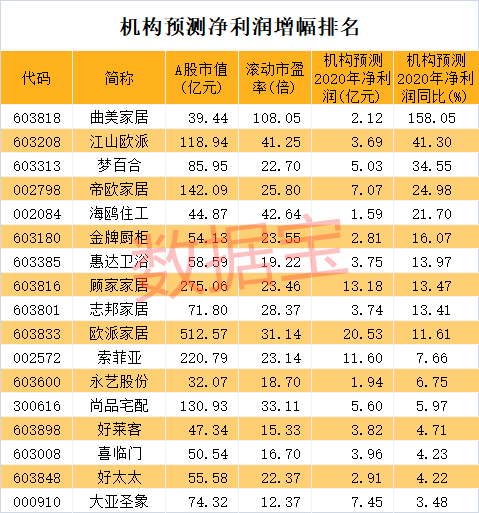 根据5家以上机构一致预测数据,今年家居用品板块中有5股净利润有望同比增长20%以上,分别是曲美家居、江山欧派、梦百合、帝欧家居、海鸥住工。预测净利润增幅最高的是曲美家居,机构一致预测其今年净利润为2.12亿元,同比增长158.05%。具体名单见下表: