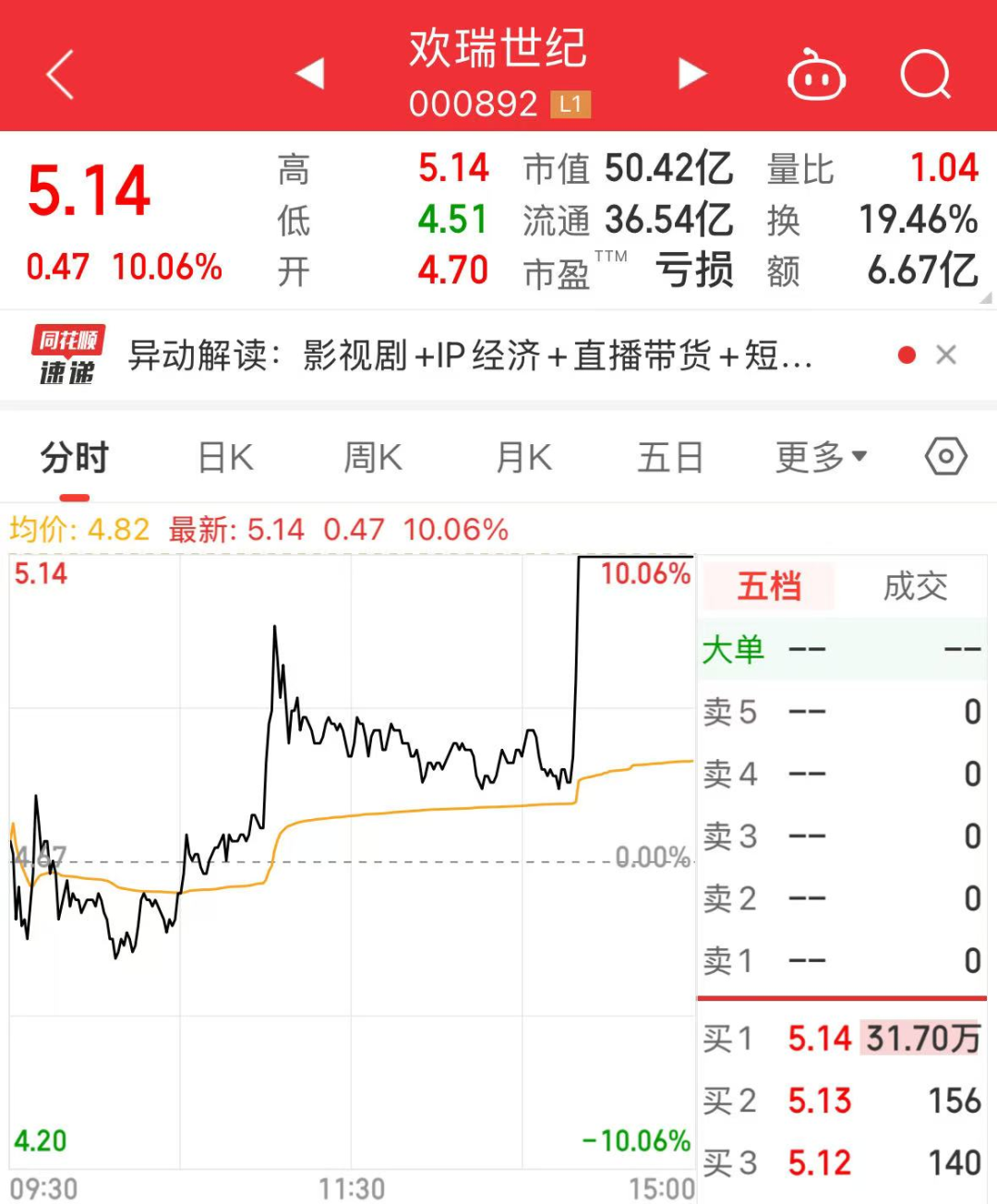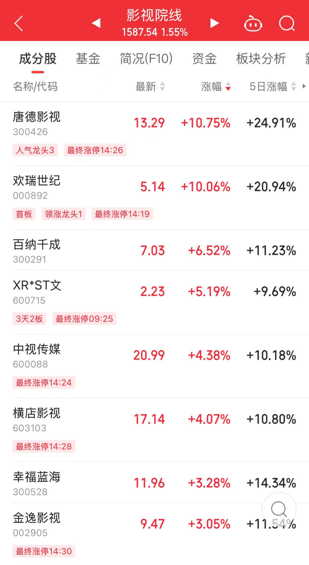 截至收盘时,欢瑞世纪封住涨停,涨幅靠前的影视股还有唐德影视、华闻集团、百纳千成、龙版传媒、内蒙新华等。
