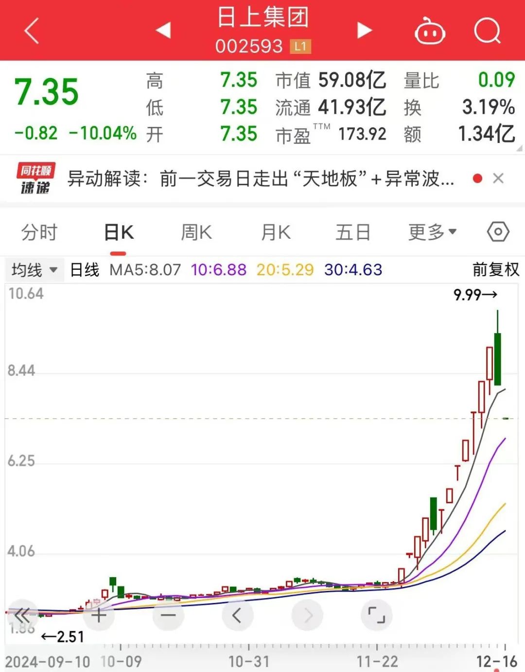 山东玻纤也遭遇类似情况,今日跌停板封单达42.49万手;帅丰电器今日大幅高开后触及涨停板,午后股价跌停,上演“天地板”。