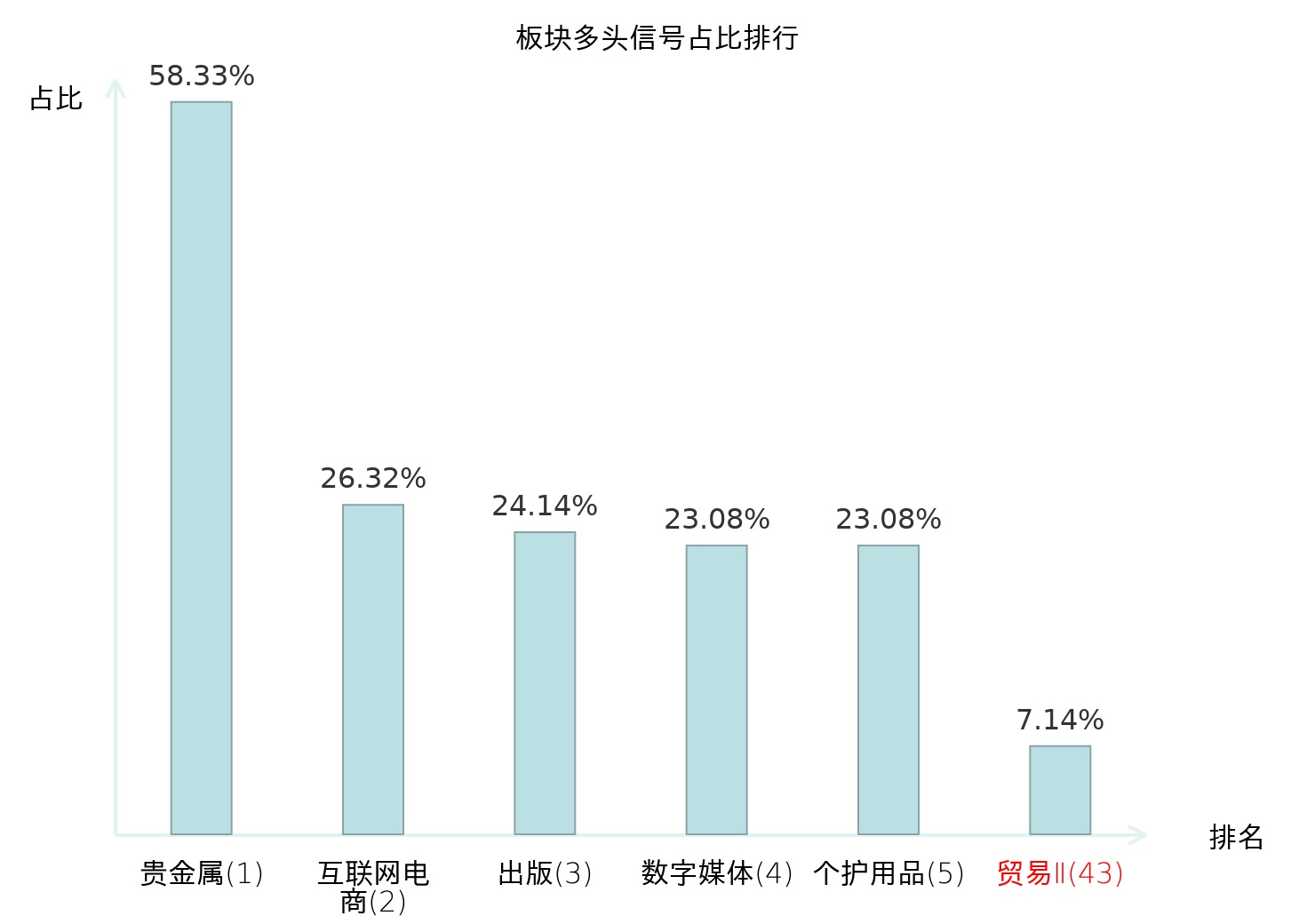 全市场所有行业板块中主力多头信号占比排名中,贵金属板块位居第一。贵金属板块名次提升最快,较昨日上升108位。