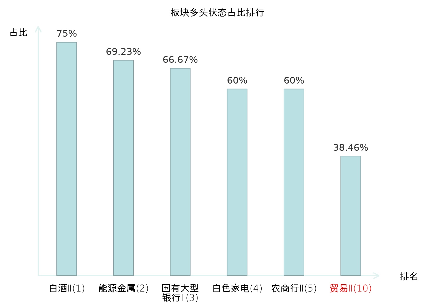全市场所有行业板块中主力多头状态占比排名中,白酒Ⅱ板块位居第一。房地产服务板块名次提升最快,较昨日上升86位。