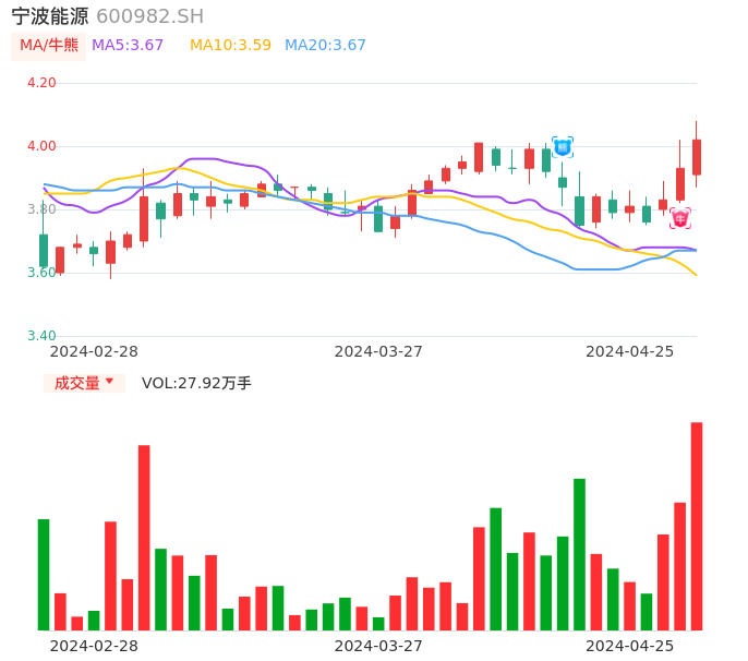 04月25日,宁波能源收报4.02,股价涨幅2.29%,成交金额1.11亿元,换手率2.50%。