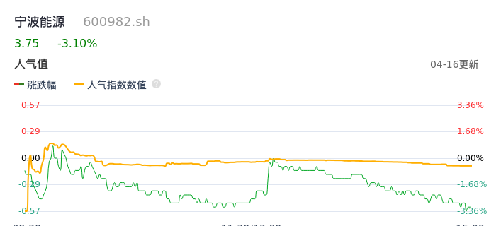 04月16日,宁波能源收报3.75,股价涨幅-3.10%,成交金额8273.90万元,换手率1.94%。