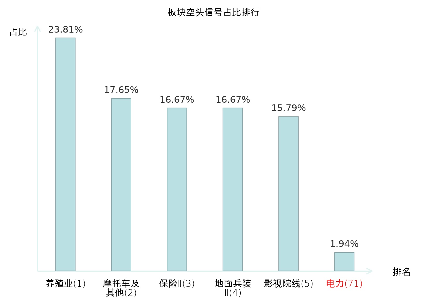 全市场所有行业板块中主力空头信号占比排名中,养殖业板块位居第一。养殖业板块名次提升最快,较昨日上升114位。