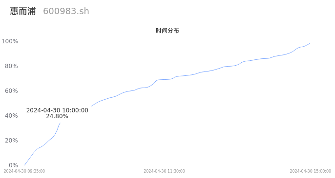 600983惠而浦2024年04月30日成交2.55万手,成交金额2257.34万元,相较昨日放量4133手,换手率0.33%,成交清淡。
