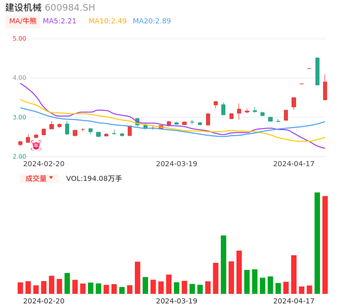04月17日,建设机械收报3.90,股价涨幅2.09%,成交金额7.08亿元,换手率15.44%。