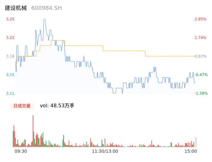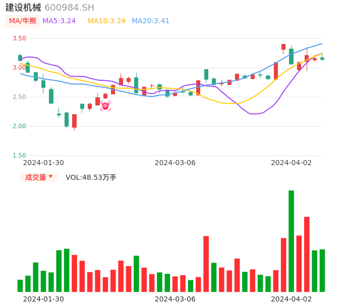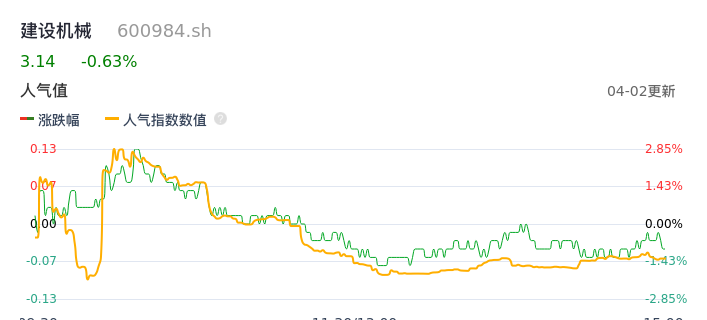 04月02日,建设机械收报3.14,股价涨幅-0.63%,成交金额1.54亿元,换手率3.86%。