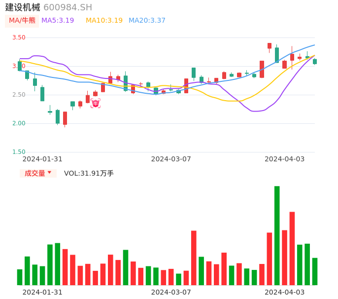04月03日,建设机械收报3.04,股价涨幅-3.18%,成交金额9757.25万元,换手率2.54%。