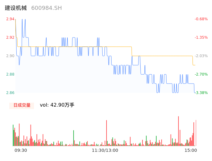 04月25日,建设机械收报2.86,股价涨幅-3.38%,成交金额1.24亿元,换手率3.41%。