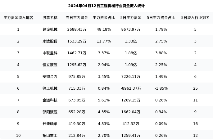 建设机械今日净流入2688.43万元,主力占比48.18%,在行业内排名:1/26;5日净流入8673.97万元,主力占比1.79%,在行业内排名:5/26。