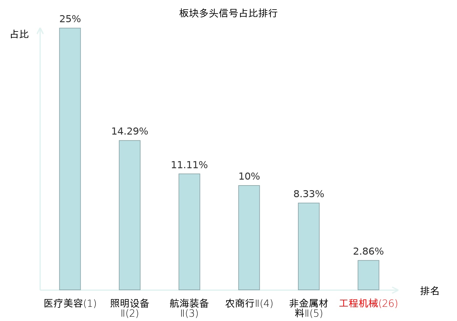 全市场所有行业板块中主力多头信号占比排名中,医疗美容板块位居第一。医疗美容板块名次提升最快,较昨日上升126位。