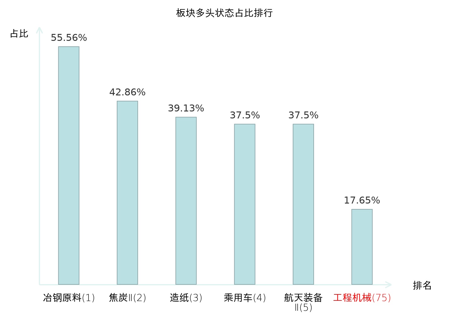 全市场所有行业板块中主力多头状态占比排名中,冶钢原料板块位居第一。房屋建设Ⅱ板块名次提升最快,较昨日上升84位。