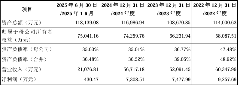 财务方面,于2022年度、2023年度、2024年度及2025年1-6月,公司实现营业收入分别约为6.03亿元、5.21亿元、5.67亿元、2.11亿元人民币;同期,净利润分别为9257.69万元、7477.99万元、7308.51万元、430.47万元人民币。