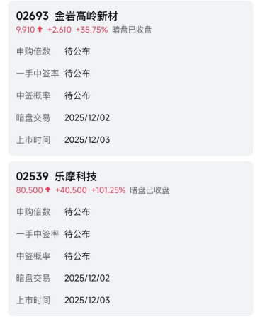 12月3日,港股又将迎来乐摩科技和金岩高岭新材两只新股。而在12月2日晚间,这两只新股进入暗盘时间,富途牛牛显示,两股的暗盘表现都极为亮眼,金岩高岭新材暗盘涨幅超过35%,而乐摩科技涨幅更是超过100%。