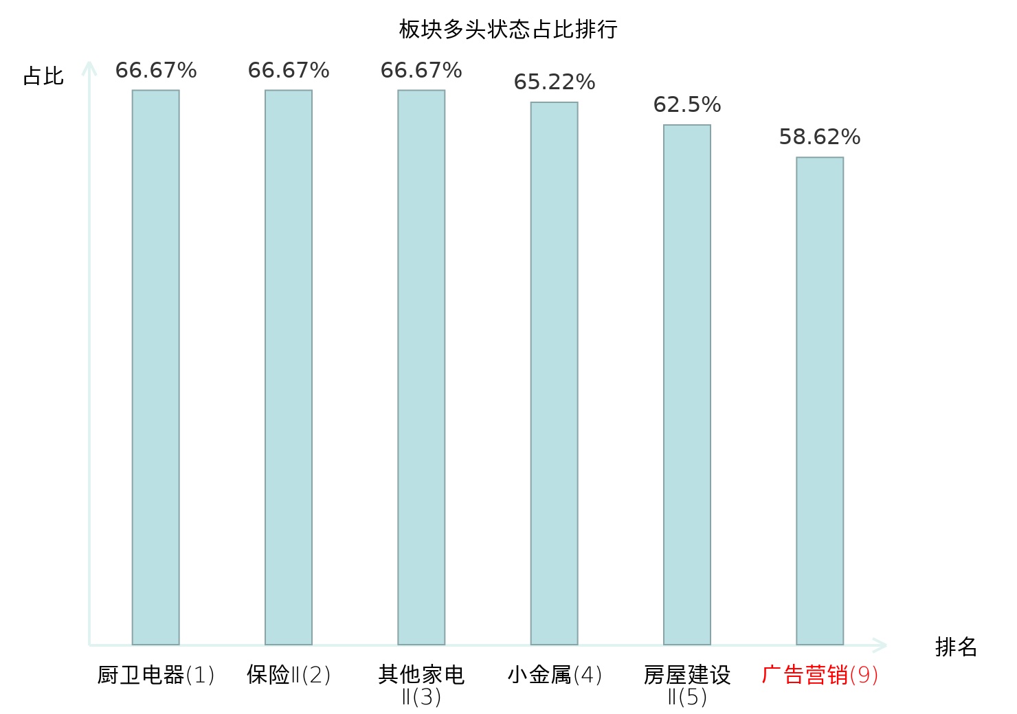 全市场所有行业板块中主力多头状态占比排名中,厨卫电器板块位居第一。乘用车板块名次提升最快,较昨日上升82位。
