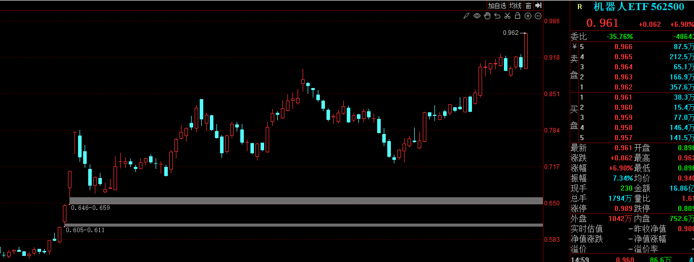 今天百股涨停,一般都是机器人。直接引爆行情了。大家看看机器人ETF最近的走势,只能说太夸张。漂漂亮亮的牛市走势。给人一种一眼看不到顶的走势。