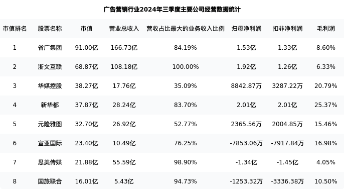 浙文互联最新报告期数据为三季度,下表汇总了广告营销行业内市值靠前的公司三季度主要经营数据