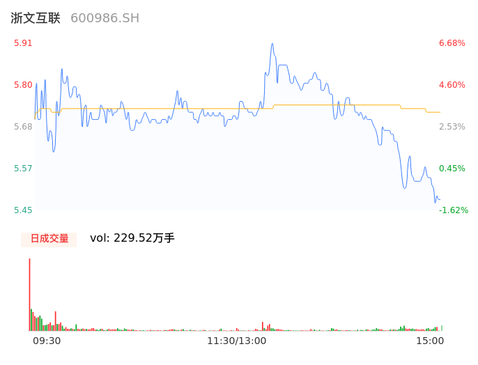 04月12日,浙文互联收报5.45,股价涨幅-1.62%,成交金额13.12亿元,换手率17.36%。
