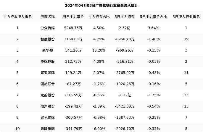 从主力资金流向来看,广告营销行业今日主力资金流入17.04亿元,在所有申万二级行业中排名:123/131。