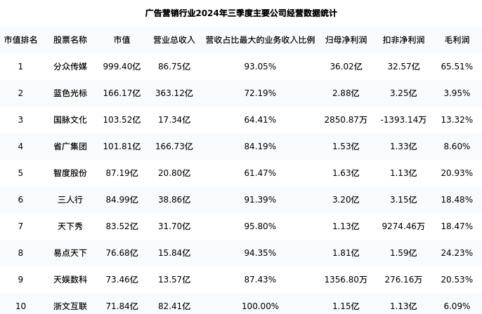 浙文互联最新报告期数据为三季度,下表汇总了广告营销行业内市值靠前的公司三季度主要经营数据