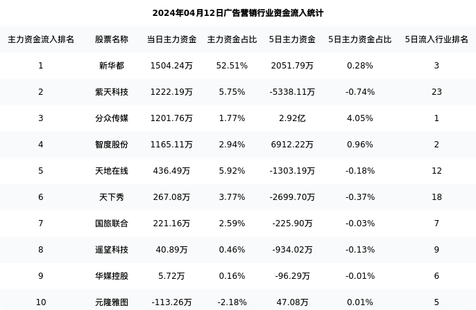 从主力资金流向来看,广告营销行业今日主力资金流入14.98亿元,在所有申万二级行业中排名:127/131。