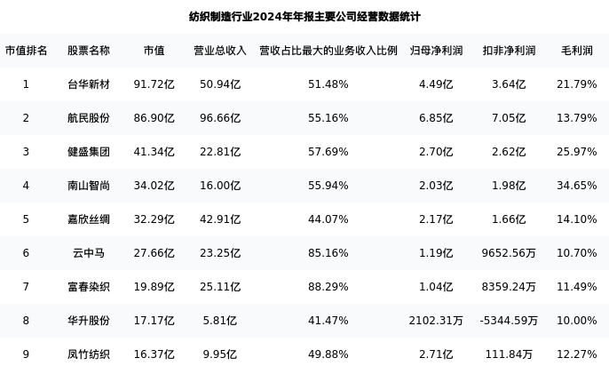 航民股份最新报告期数据为年报,下表汇总了纺织制造行业内市值靠前的公司年报主要经营数据