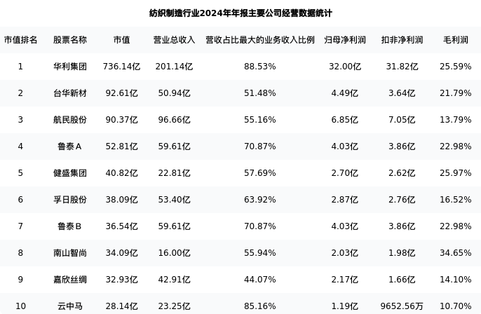 航民股份最新报告期数据为年报,下表汇总了纺织制造行业内市值靠前的公司年报主要经营数据