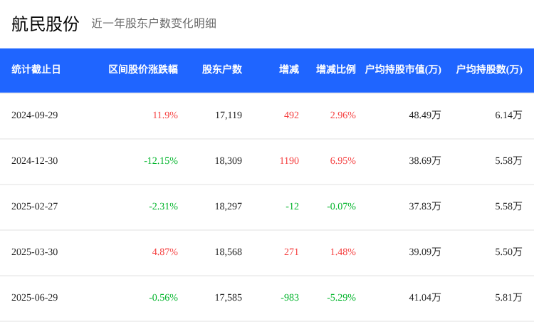 截至2025年6月30日,航民股份(600987)的股东户数为1.76万户,较上一期减少了5.29%。同时,户均持股数量增至5.59万股,户均持股市值达到41.04万元,环比增加5.0%。这一变化表明,航民股份的股权集中度有所提高,每位股东平均持有的股票数量和市值均有所增长。
