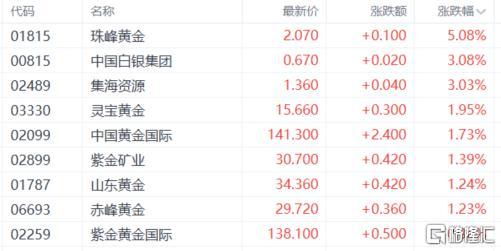 黄金股活跃,珠峰黄金涨超5%,中国白银集团集海资源灵宝黄金中国黄金国际紫金矿业山东黄金赤峰黄金紫金黄金国际等跟涨。