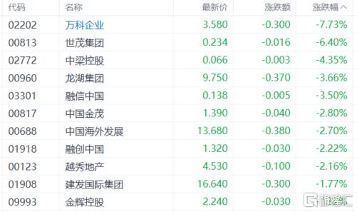 内房股低迷,万科企业跌超7%,世茂集团龙湖集团中国金茂中国海外发展等跟跌。