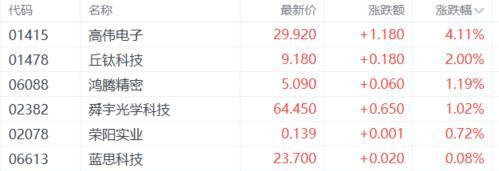 苹果概念股上涨,高伟电子涨超4%,丘钛科技、鸿腾精密、舜宇光学科技蓝思科技等跟涨。