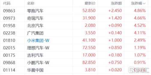 新能源车企股走高,零跑汽车奇瑞汽车北京汽车广汽集团涨超4%,小米集团-W等跟涨。
