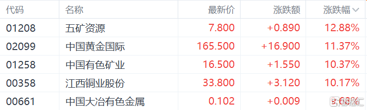 铜概念股集体走强,五矿资源涨12.88%,中国有色矿业、江西铜业股份涨超10%,中国大冶有色金属涨超9%。
