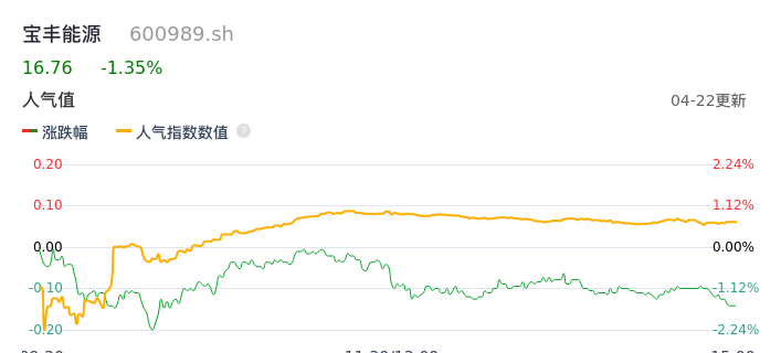 04月22日,宝丰能源收报16.76,股价涨幅-1.35%,成交金额3.50亿元,换手率0.28%。