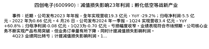 值得注意的是:2024年04月民生证券的尹会伟/孔厚融/赵博轩/冯鑫分析师,首次发布关于四创电子的研究报告,标题为:四创电子(600990):减值损失影响23年利润;孵化低空等战新产业。