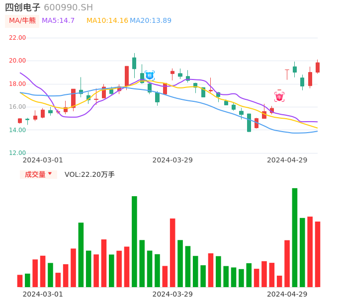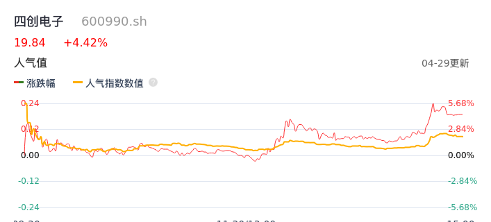 04月29日,四创电子收报19.84,股价涨幅4.42%,成交金额4.31亿元,换手率8.25%。