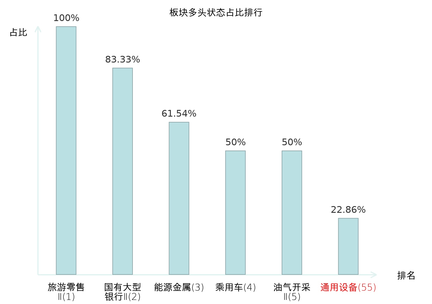 全市场所有行业板块中主力多头状态占比排名中,旅游零售Ⅱ板块位居第一。特钢Ⅱ板块名次提升最快,较昨日上升72位。