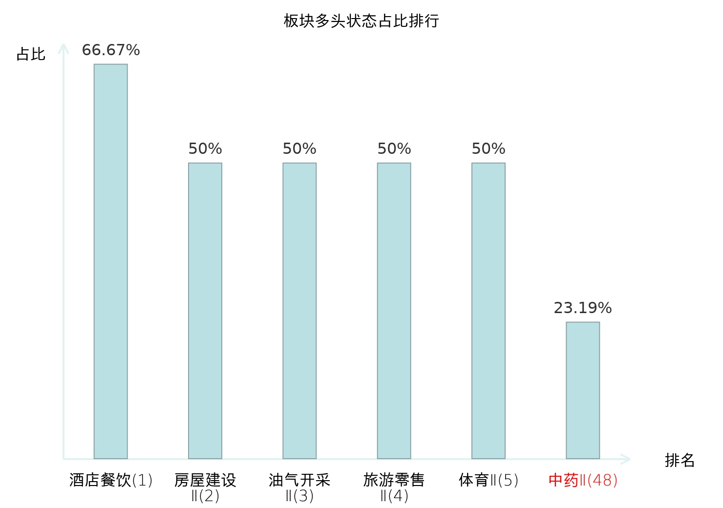 全市场所有行业板块中主力多头状态占比排名中,酒店餐饮板块位居第一。农商行Ⅱ板块名次提升最快,较昨日上升50位。