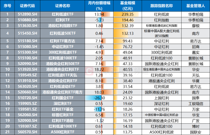 从ETF市场上看,红利系ETF近期的基金份额增多减少。截至10月17日数据,筛选基金规模超10亿元的红利系ETF,21只ETF基金中共有16只月内份额显示为增长,整体占比近76.2%。其中,规模最大的红利系ETF——红利低波ETF(512890)本月份额共增长近13.9%,并创上市以来新高,而位居第二规模的红利ETF(510880)月内份额则下降近5.7%。